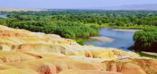 五彩滩被称作是“新疆很美的雅丹地貌”。五彩滩还兼容着“一河两岸”的美,“一河”:额尔齐斯河是我国一条注入北冰洋的外流河,额河将五彩滩分成了南北两岸;远眺南岸,有绿洲与蓝色的天际相合,风光尽收眼底。